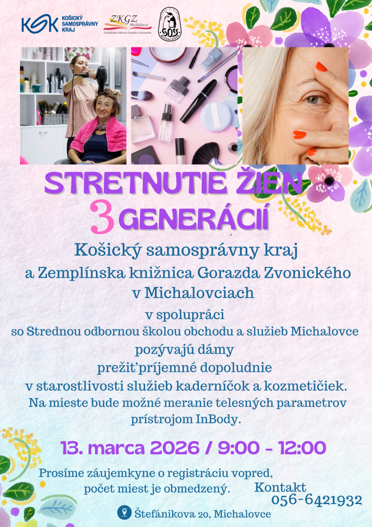 V priestoroch Zemplínskej knižnice Gorazda Zvonického v Michalovciach sa v piatok 13. marca uskutočnilo mimoriadne zaujímavé podujatie, ktoré spojilo tri generácie žien v príjemnej a inšpiratívnej atmosfére. Návštevníčky si prišli užiť dopoludnie venované výhradne starostlivosti o zovňajšok a zdravie. O ich skrášlenie sa postarali šikovné študentky Strednej odbornej školy obchodu a služieb v Michalovciach, ktoré prišli v sprievode svojich majsteriek odborného výcviku.