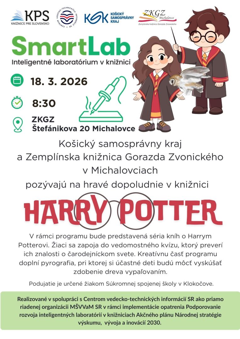 Príbeh o chlapcovi, ktorý vyrastal ako sirota u svojej tety a uja, no v jedenástich rokoch zistil, že je čarodejník. Tak sa začína dobrodružstvo Harryho Pottera na čarodejníckej škole Rokfort, kde spolu so svojimi priateľmi Ronom a Hermionou prežíva množstvo nezabudnuteľných príhod. Do čarodejníckeho sveta sme sa preniesli aj v našej knižnici a spoznali zaujímavosti z obľúbenej knižnej série. Deti sa zapojili do zábavného vedomostného kvízu a na záver si vyskúšali techniku pyrografie a vytvorili si originálne obrázky. Cieľom podujatia bolo podporiť záujem detí o čítanie a rozvíjať ich fantáziu a tvorivosť. Podujatie bolo realizované v spolupráci s Centrom vedecko-technických informácií SR ako priamo riadenej organizácii MŠVVaM SR v rámci implementácie opatrenia Podporovanie rozvoja inteligentných laboratórií v knižniciach Akčného plánu Národnej stratégie výskumu, vývoja a inovácií 2030.