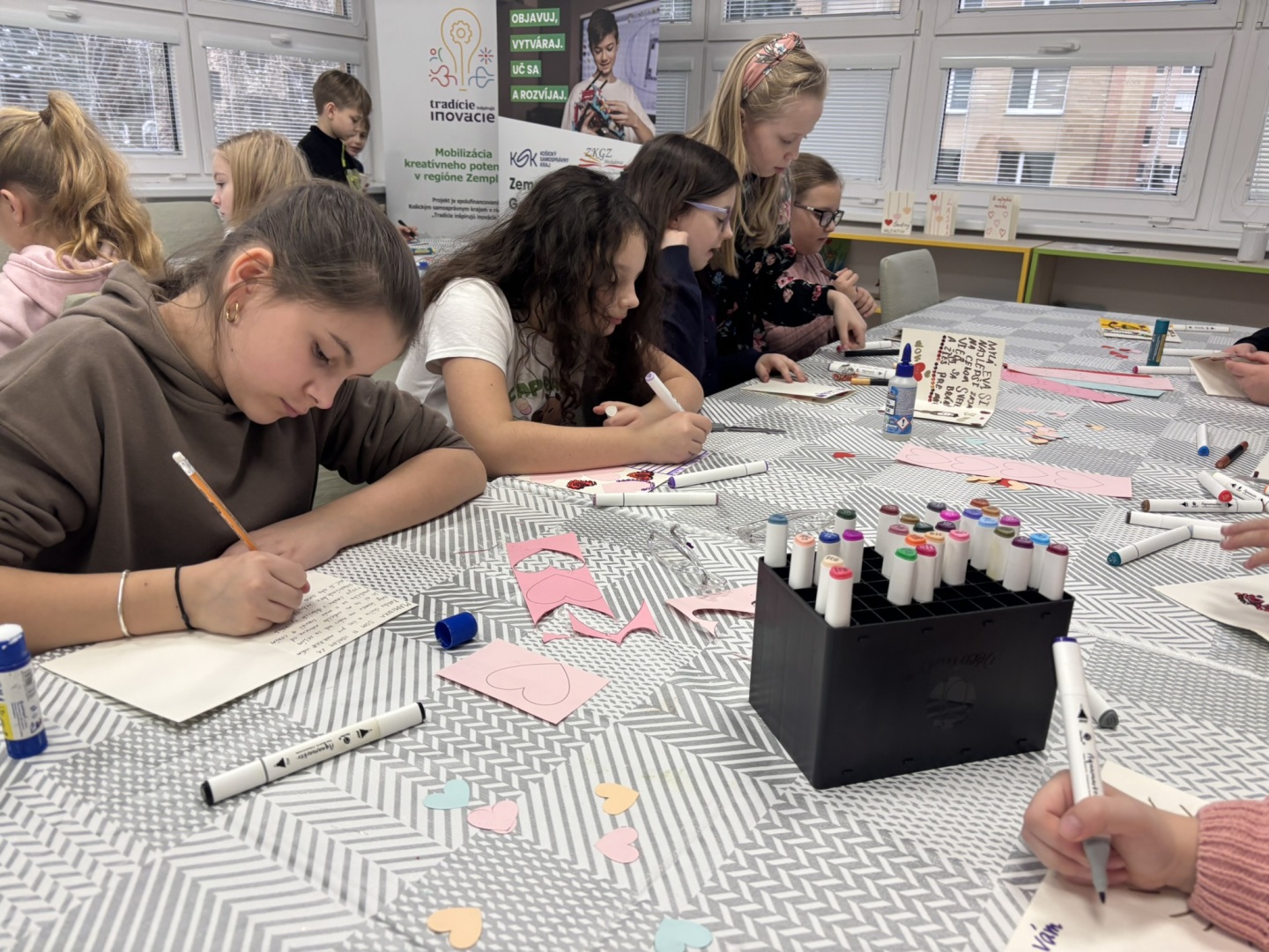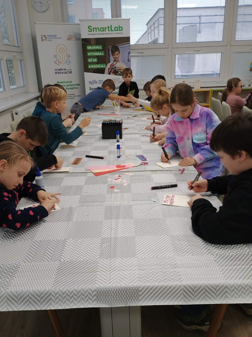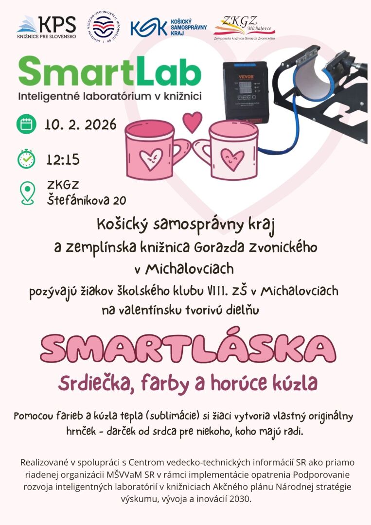 V knižnici sme dňa 10.2.2026 privítali šikovné deti zo školského klubu základnej školy Pavla Horova v Michalovciach, ktoré sa premenili na malých tvorcov radosti. Spoločne sme si vyrozprávali legendu o svätom Valentínovi, následne sme vyrábali originálne šálky technikou sublimácie a nežné pohľadnice pre milované osoby. Farby žiarili, srdiečka pribúdali a horúce kúzla lisu menili nápady na krásne darčeky plné lásky.