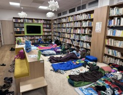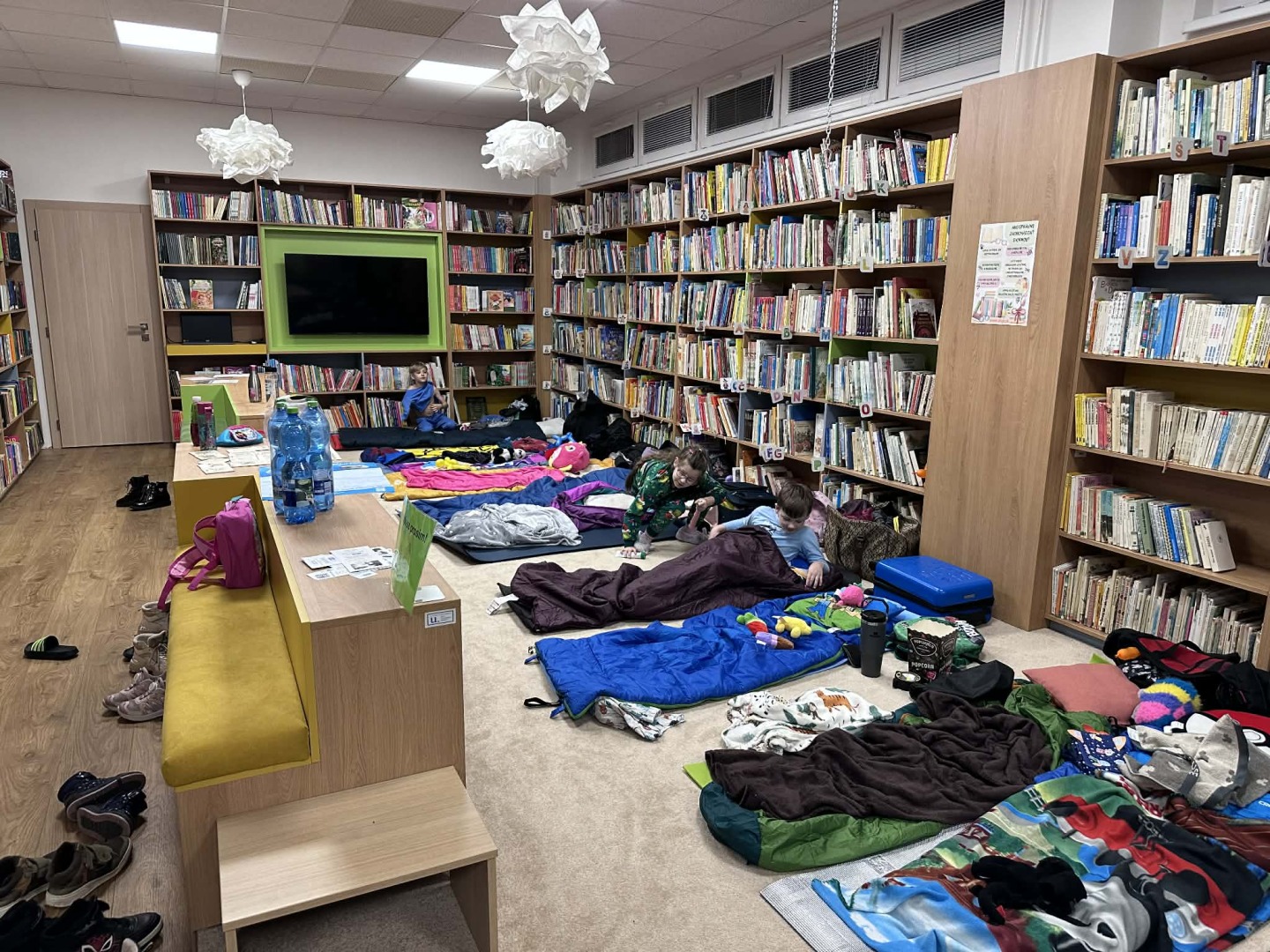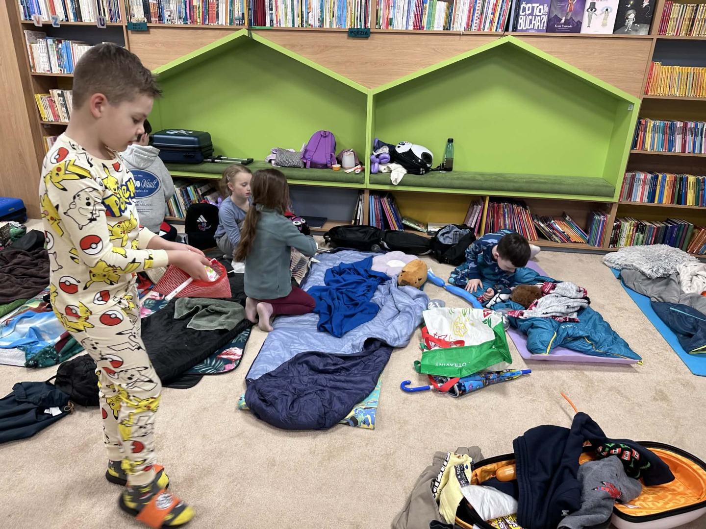 Záver večera patril oddychovej časti – kino a rozprávka na dobrú noc, ktoré navodili pokojnú atmosféru pred spaním. Deti si následne rozložili svoje miesta na spanie priamo v knižnici a užili si jedinečný zážitok z prespania medzi knihami.