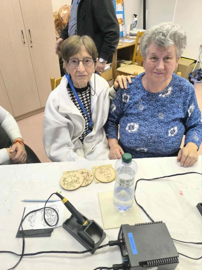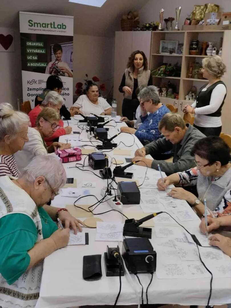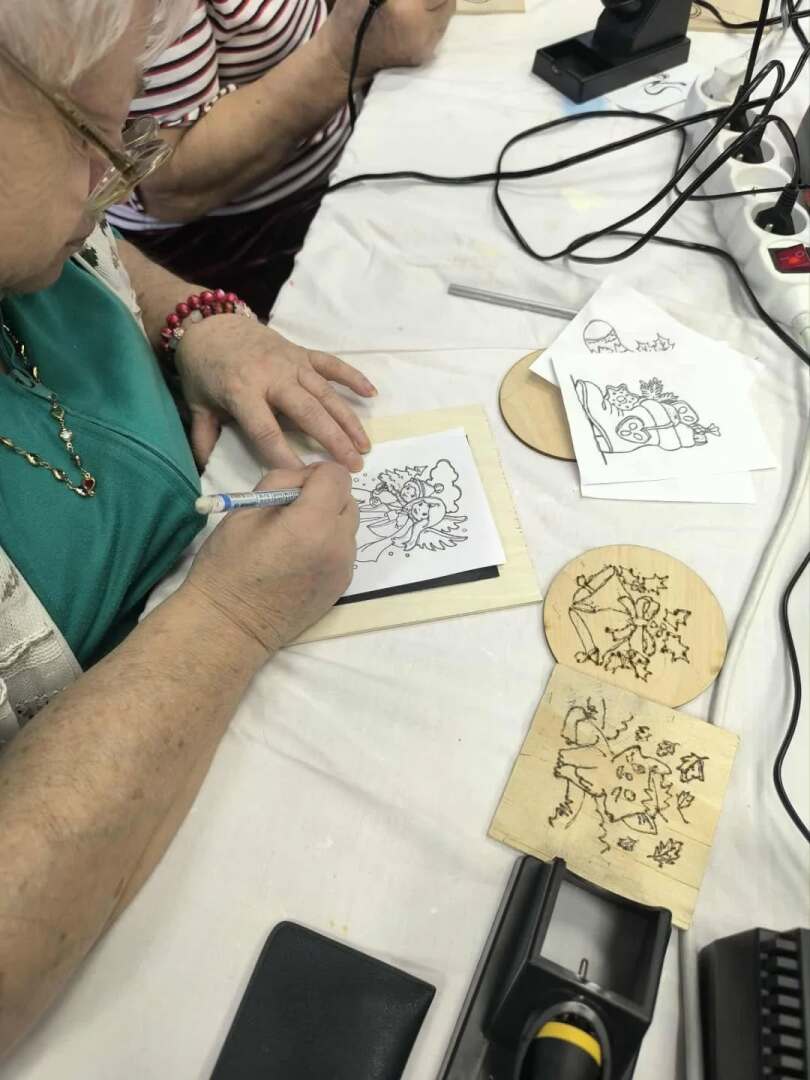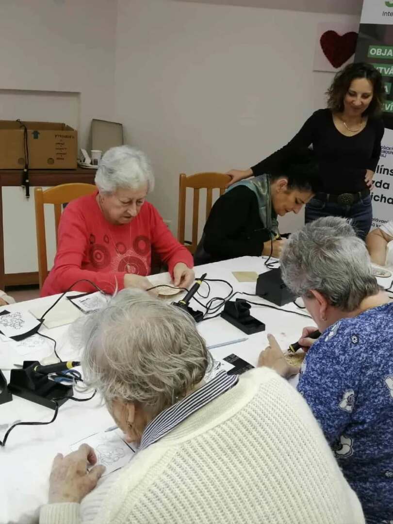 Účastníci sa venovali technike vypaľovania do dreva, no tentoraz pracovali s vianočnými motívmi – snehové vločky, stromčeky, zvončeky či jemné sviatočné ornamenty. Seniori tvorili s veľkým záujmom a radosťou, starostlivo dotvárali detaily a vytvárali tak originálne drevené ozdoby a podložky, ktoré si počas Vianoc nájdu svoje miesto v ich domácnostiach. O príjemnú atmosféru sa postaral podmaz vianočnej hudby, ktorý okamžite vytvoril teplú, predvianočnú náladu. Seniori sa veľmi tešili zo svojich výtvorov, navzájom si ich obdivovali a s úsmevom rozprávali o tom, komu nimi urobia radosť. Niektoré účastníčky si takto pripravili aj malé vianočné darčeky pre svoje deti, vnúčatá a pravnúčatká.