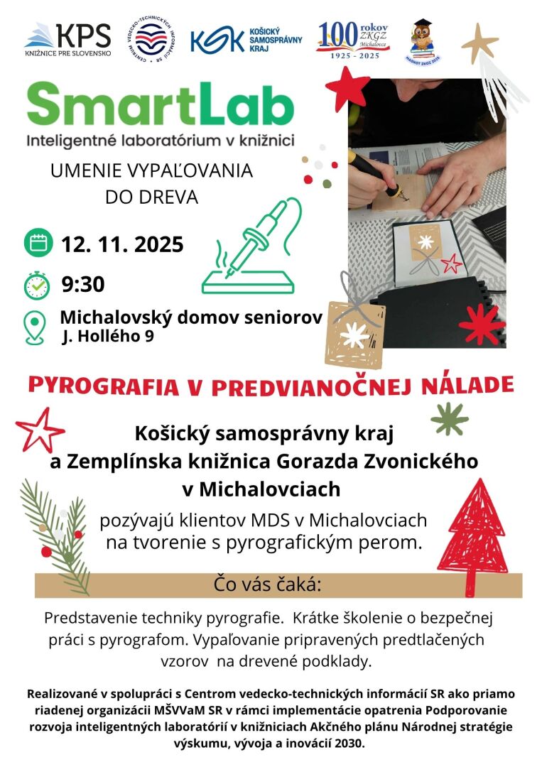Zemplínska knižnica Gorazda Zvonického v Michalovciach pripravila dňa 12. novembra 2025 ďalšie tvorivé stretnutie pre seniorov v priestoroch Michalovského domova seniorov na Hollého ulici 9. Tentoraz sme sa naladili na blížiace sa sviatky podujatím s názvom „Vianočná pyrografia“