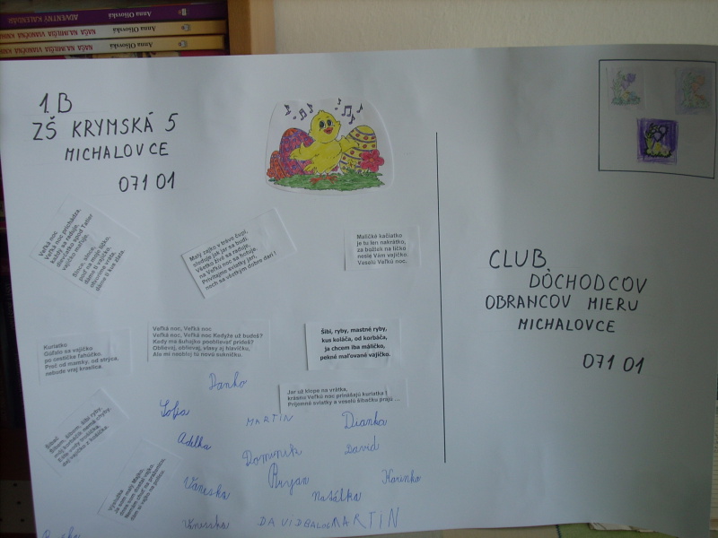 Veľkonočný pozdrav pre Klub dôchodcov. Každý žiak prispel obrázkom aj