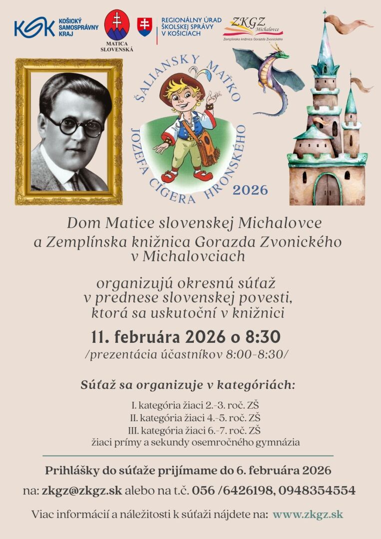 Dňa 11. februára 2026 sa v ZKGZ v Michalovciach uskutočnil 31. ročník okresného kola súťaže Šaliansky Maťko Jozefa Cígera-Hronského v prednese slovenských povestí pre žiakov základných škôl. Do súťaže sa zapojilo 27 recitátorov. Organizátormi podujatia boli Dom Matice slovenskej v Michalovciach a ZKGZ v Michalovciach.