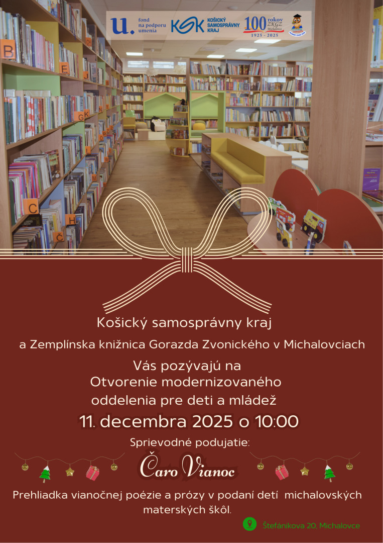 V jubilejnom roku sa návštevníci ZKGZ v Michalovciach môžu tešiť zo schváleného projektu, vďaka ktorému majú deti nové moderné oddelenie. 11.12.2025 sa v ZKGZ v Michalovciach uskutočnilo otvorenie komplexne zmodernizovaného detského oddelenia a vstupných priestorov vďaka schválenému projektu Fondu na podporu umenia 100 rokov vzdelávania a kultúry. Projekt sme realizovali od 1.1.2025 – 31.12.2025 a rozpočet projektu bol vo výške cca 56 000,00 eur. Zriaďovateľ KSK nám na spolufinancovanie prispel sumou cca 11 800,00 eur. Cieľom projektu bolo nielen vytvorenie moderného, atraktívneho prostredia, ale vznikol aj nový priestor pre kultúrne a vzdelávacie podujatia pre detských čitateľov. V kultúrnom programe vystúpili žiaci Základnej umeleckej školy v Michalovciach.