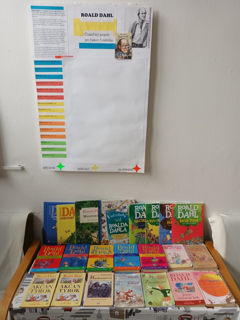 Naše stretnutie v knižnici bolo zamerané na predstavenie autora Roalda Dahla a jeho knihy Matilda, ktorú sa žiaci 3.A triedy spoločne s pani učiteľkou Mgr. Vodhanelovou chystajú prečítať. Súčasťou podujatia bola aj výstavka kníh Roalda Dahla. Čitatelia sa dozvedeli o živote tohto spisovateľa, aj o jeho ďalších zaujímavých knihách, ktoré sú dostupné pre našich čitateľov na tejto školskej pobočke.