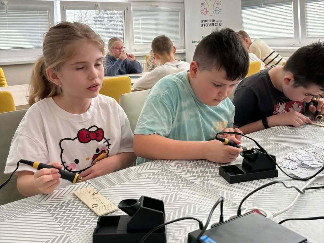 Po krátkom zaškolení za mladých majstrov sa už všetci sústredili na hlavný bod programu – pyrografiu. Sústredené pohľady, pevná ruka a jemný dym stúpajúci od stolov – taká bola atmosféra v našom tvorivom laboratóriu. Pomocou pyrografických pier deti vypaľovali do drevených záložiek svoje mená či obľúbené motívy.