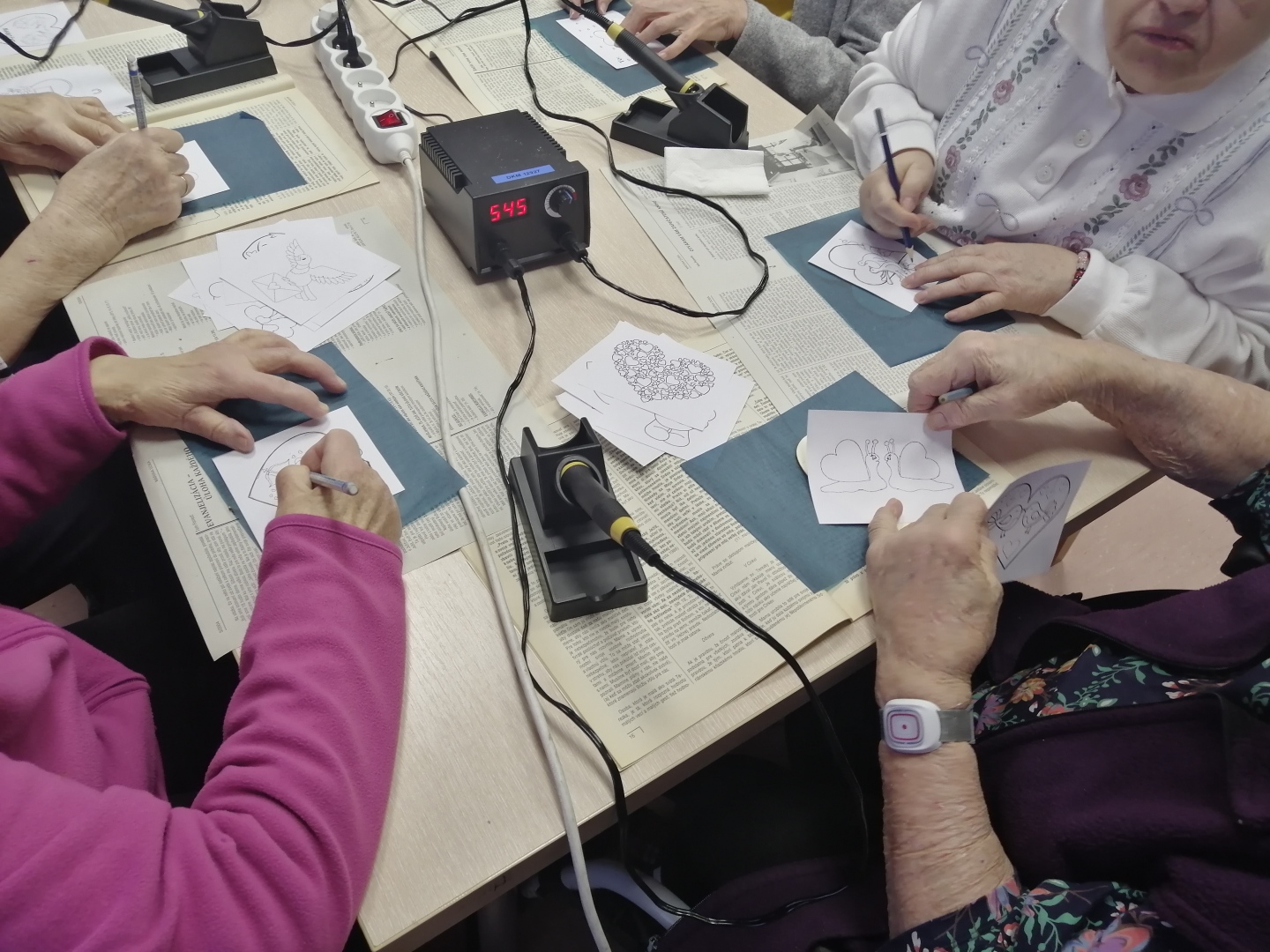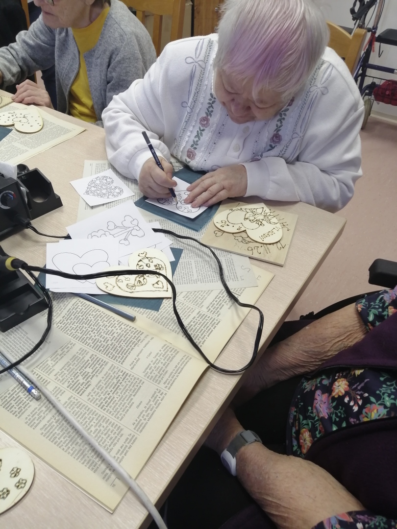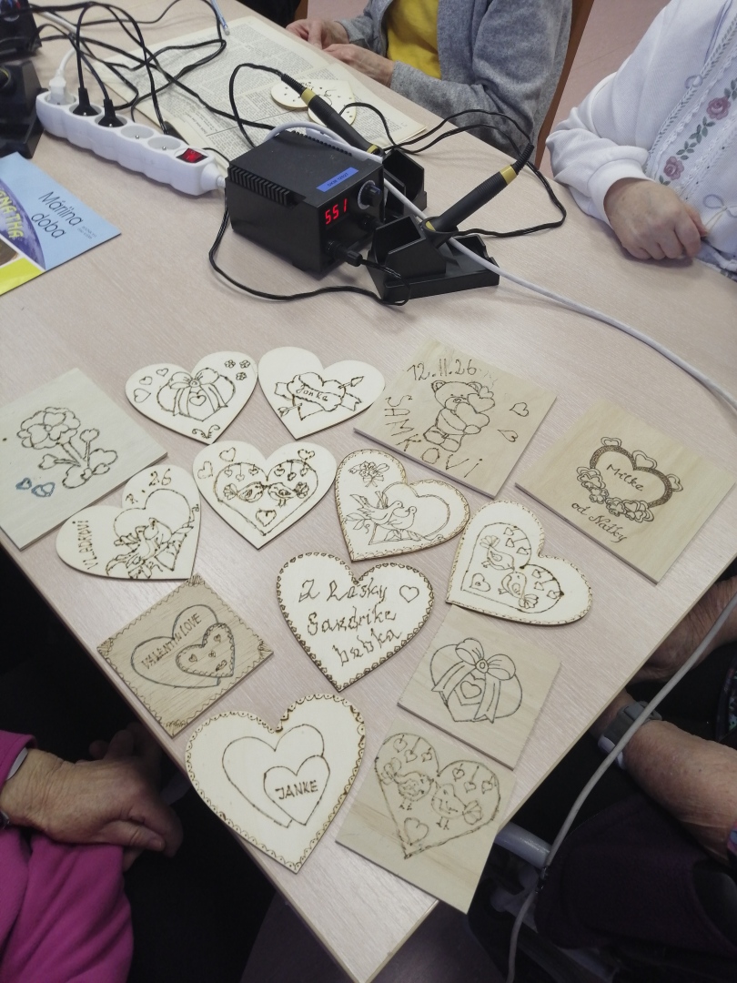 Podujatie sa nieslo v príjemnej a srdečnej atmosfére. Seniori si vyskúšali prácu s pyrografickým perom, pomocou ktorého vypaľovali do dreva rôzne jemné vzory a motívy lásky. Vznikali krásne, originálne dielka – srdiečka, ornamenty i osobné odkazy – ktoré si účastníci pripravovali ako milé darčeky pre svoje deti, vnúčatá a pravnúčatá.