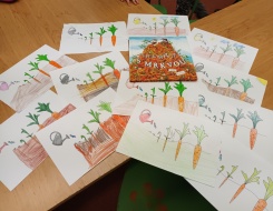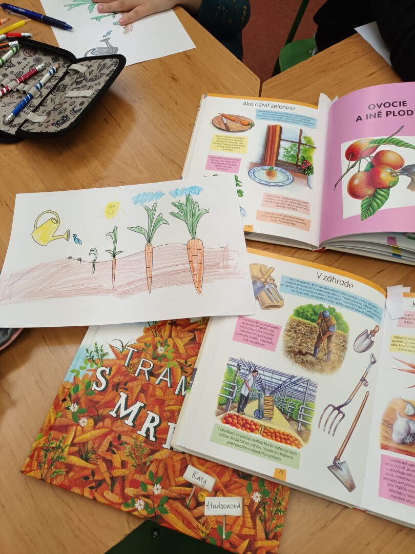 Malý zajačik má veľmi rád mrkvu. Vlastne ju má tak veľmi rád, že si ňou zapratal svoju útulnú noru a teraz nemá kde bývať. Tak si hľadá nový domov... . Keď mu kamaráti ponúknu pomoc, zajac s potešením súhlasí. No nespôsobí priveľa mrkvy zajacovi a jeho kamarátom príliš veľké trampoty? A ako sa dokážu kamaráti vysporiadať s týmto problémom? To všetko sme sa spolu s malými druhákmi a pani učiteľkou Mgr. Pajonkovou dozvedeli z krásnej knižky od Katy Hudson Trampoty s mrkvou. V tejto knihe sú okrem poučného textu aj krásne ilustrácie, ktoré pomohli deťom pri úlohách. Pomohli aj knihy s náučnou tematikou. A keď sa vieme podeliť, všetky problémy sú zrazu vyriešené.