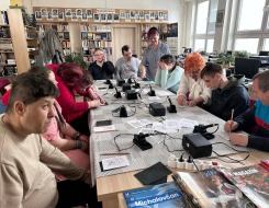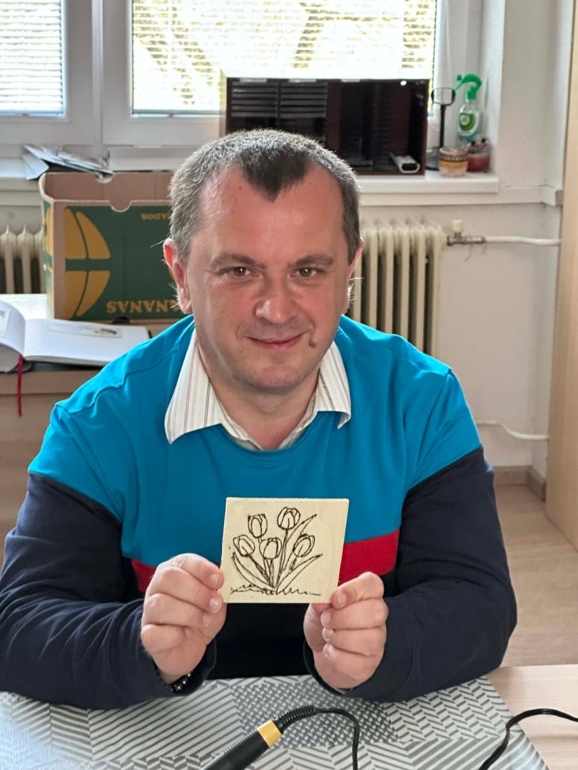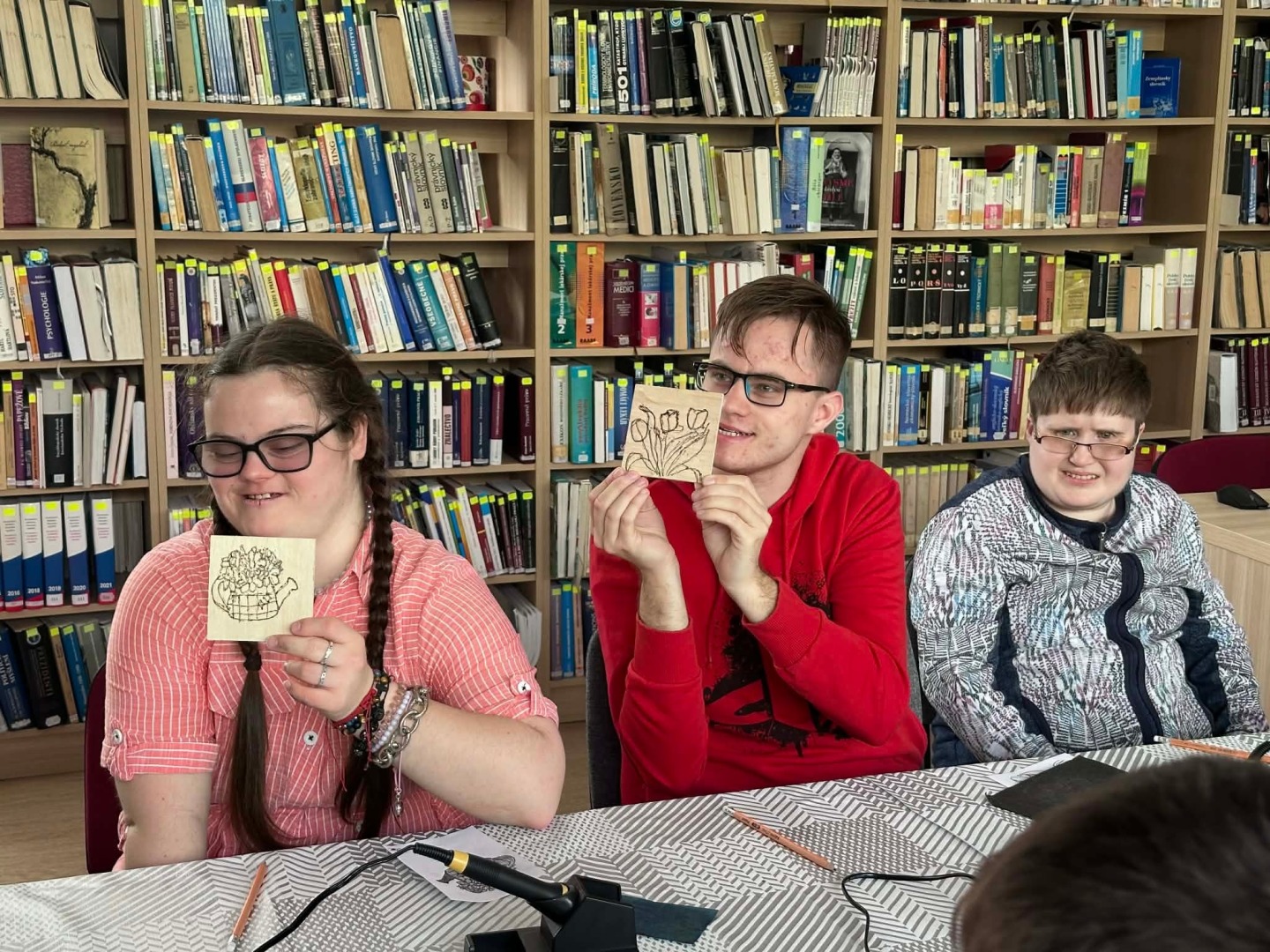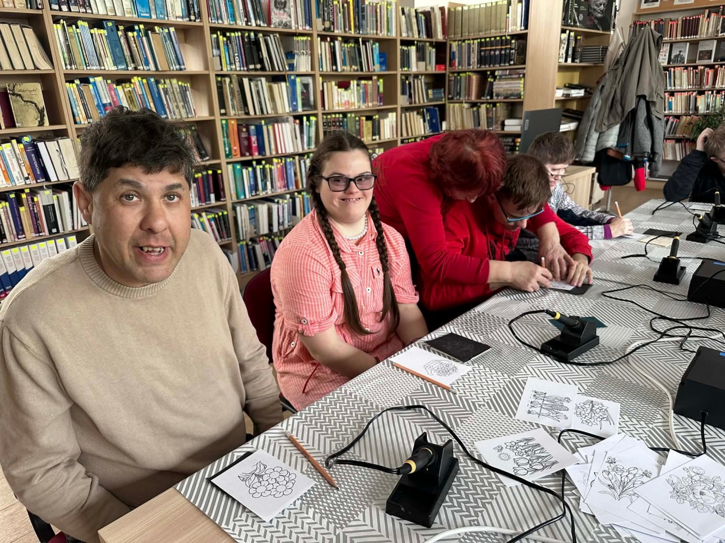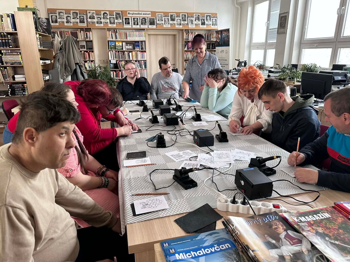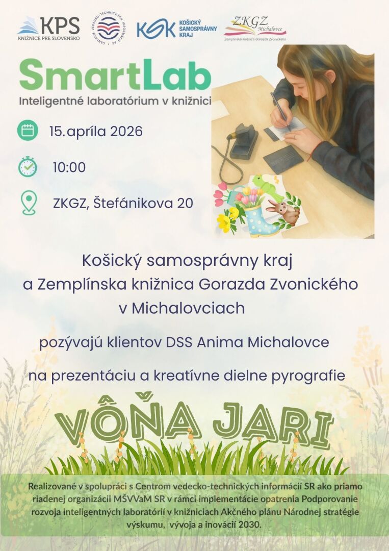 Oddelenie pre deti a mládež pripravilo 15.4.2026 prezentáciu a tvorivú dielňu Smartlab – inteligentné laboratórium v knižnici pre 12 klientov KCSS – DSS Anima Michalovce. Pyrografickym perom prenášali obrázky jarných kvetín do dreva .